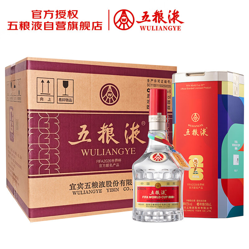 五粮液 普五八代 世界杯联名款 浓香型白酒 52度 500mL*6瓶 整箱装